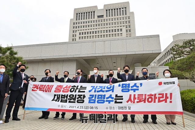 주호영 국민의힘 대표 권한대행, 김태훈 한반도인권과통일을위한변호사모임 대표를 비롯한 참석자들이 23일 오전 서울 서초구 대법원 앞에서 열린 김명수 대법원장 사퇴촉구 기자회견에서 구호를 외치고 있다.이들은 "김명수 대법원장은 사법부 수장으로서 사법부의 독립을 수호하기는커녕, 정권의 하수인 노릇을 자처해 법치주의 파괴에 앞장서고 있다"라며 "법의 날 전 즉각 사퇴할 것을 촉구한다"고 말했다.제58회 법의날을 맞아 열린 기자회견에는 주호영 국민의힘 대표 권한대행을 비롯한 국민의힘 법사위 소속 의원, 이재오 비상시국연대 대표 등이 참석했다.