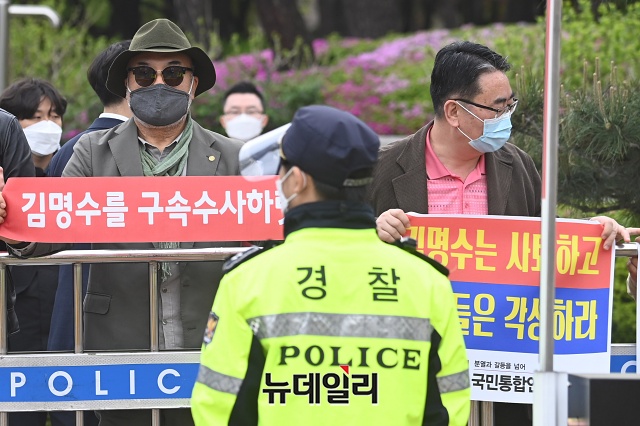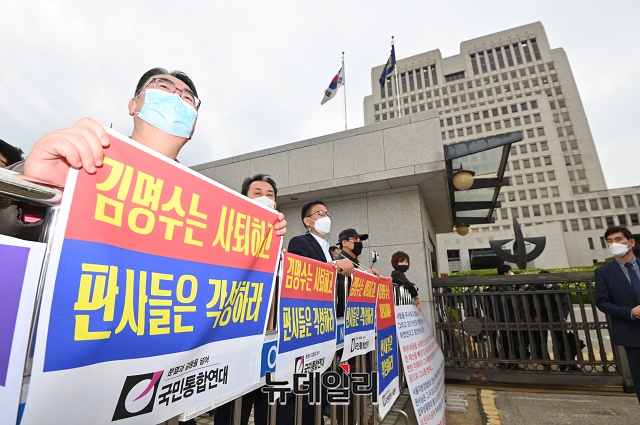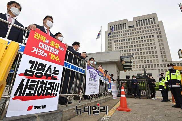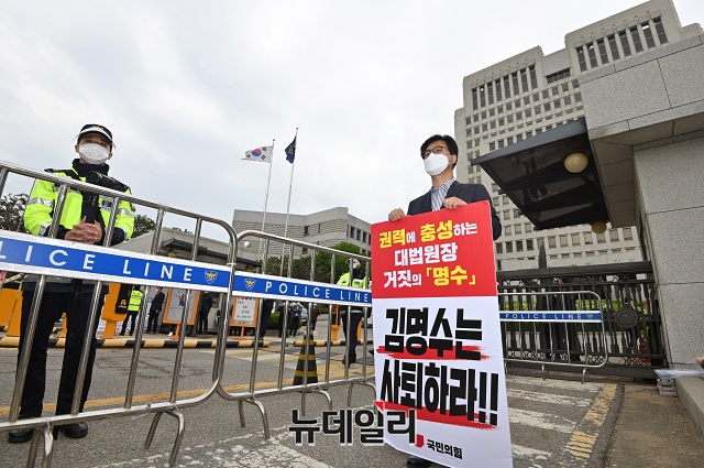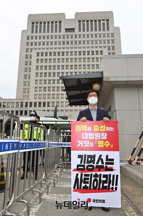 김영식 의원이 23일 오전 서울 서초구 대법원 앞에서 김명수 대법원장 사퇴촉구 1인 시위를 하고 있다.이들은 "김명수 대법원장은 사법부 수장으로서 사법부의 독립을 수호하기는커녕, 정권의 하수인 노릇을 자처해 법치주의 파괴에 앞장서고 있다"라며 "법의 날 전 즉각 사퇴할 것을 촉구한다"고 말했다.제58회 법의날을 맞아 열린 기자회견에는 주호영 국민의힘 대표 권한대행을 비롯한 국민의힘 법사위 소속 의원, 이재오 비상시국연대 대표 등이 참석했다.