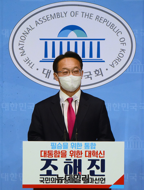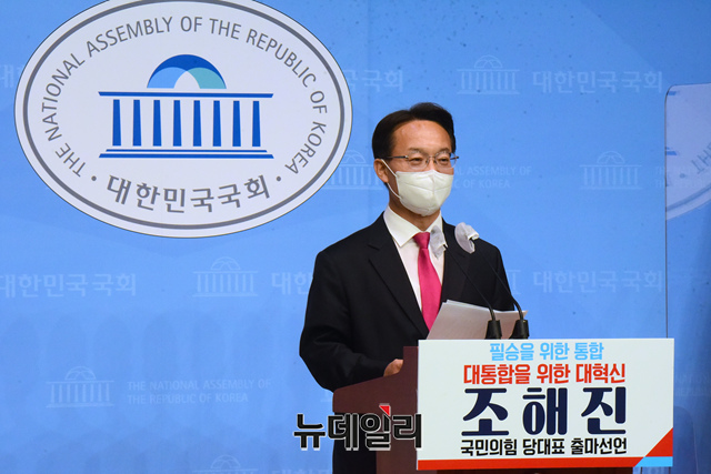 조해진 국민의힘 의원이 23일 오전 국회 소통관에서 당대표 선거 출마를 선언하고 있다.
