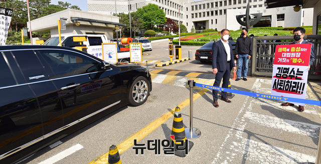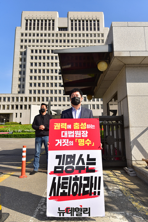 정찬민 국민의힘 의원이 26일 오전 서울 서초구 대법원 입구에서 김명수 대법원장의 차량이 법원 입구를 통과하는 가운데 사퇴를 촉구하는 피켓을 들고 1인 릴레이 시위를 이어가고 있다.이날 김 대법원장의 출근시간에 맞춰 비상시국연대, 자유연대 등 시민단체가 사퇴를 촉구하는 기자회견을 이어갔다. 기자회견에는 김기현 의원, 이재오 비상시국연대 대표 등이 참석했다.앞서 법의날인 26일 국민의힘과 시민단체 등이 김 대법원장의 사퇴를 촉구하는 기자회견을 열기도 했다.