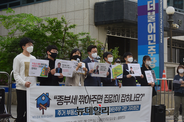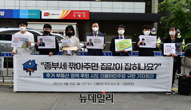 참여연대 관계자들이 26일 오전 서울 여의도 더불어민주 중앙당사 앞에서 종합부동산세 등과 관련해 여당의 부동산 정책 후퇴 규탄 기자회견을 갖고 있다.