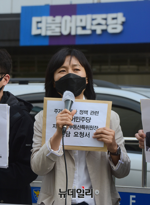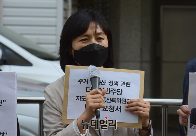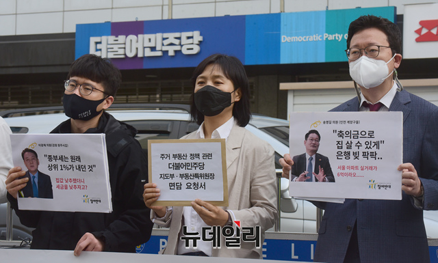 참여연대 관계자들이 26일 오전 서울 여의도 더불어민주 중앙당사 앞에서 종합부동산세 등과 관련해 여당의 부동산 정책 후퇴 규탄 기자회견을 갖고 있다.