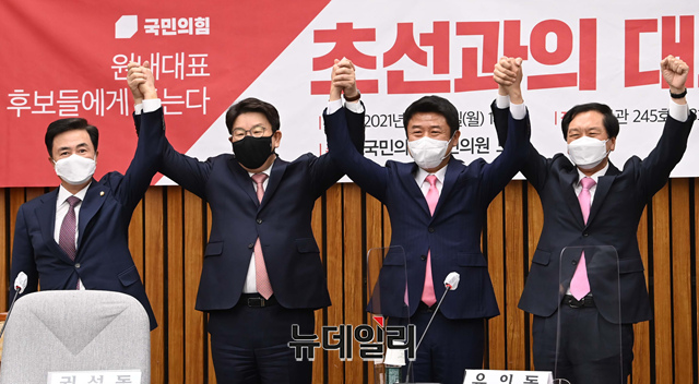 국민의힘 원내대표 경선에 나선 김태흠, 권성동, 유의동, 김기현 의원이 26일 국회에서 열린 '초선들과의 대화-원내대표 후보에게 듣는다' 토론회에 참석해 기념촬영을 하고 있다.