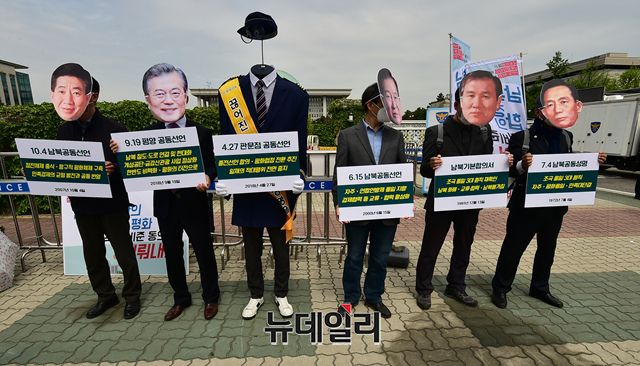 희망래일 등 시민사회단체 관계자들이 27일 오전 국회 앞에서 역대 대통령 얼굴 가면을 쓰고 남북정상합의 국회 비준 동의 촉구 기자회견을 갖고 있다.