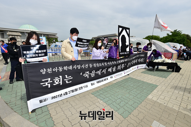 국제아동인권센터, 정치하는 엄마들, 민주사회를 위한 변호사모임 아동위원회 등 시민사회단체 회원들이 27일 오전 국회 앞에서 기자회견을 갖고 양천아동학대사망사건 등 진상조사 및 아동학대 근절대책 마련 등을 위한 특별법안 제정을 촉구하는 기자회견을 갖고 있다.