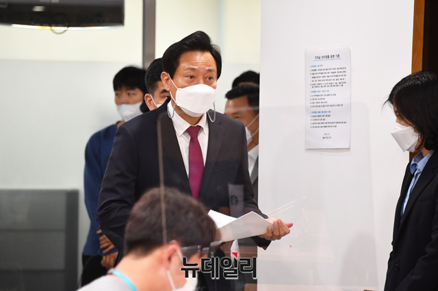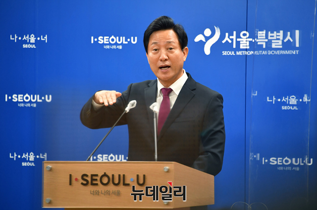 오세훈 서울시장이 27일 오전 서울시청에서 현재 진행중인 광화문 광장 조성사업에 관한 입장을 밝히고 있다. 오 시장은 "원상복구의 경우 복구 비용까지 최소 400억원의 매몰 비용이 발생한다"며 "현재 계획된 안을 바탕으로 보완·발전해 완성도를 높이기로 결론 내렸다"고 말했다. (사진=서울시)