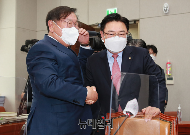 더불어민주당 소속 김태년 위원장이 27일 국회에서 열린 운영위원회 전체회의 산회 후 국민의힘 김성원 원내수석부대표와 인사를 나누고 있다. (사진=공동취재단)