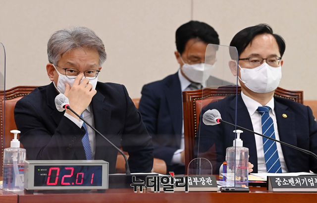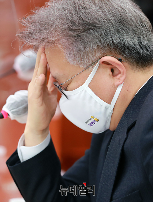 권칠승 중소벤처기업부 장관이 28일 오후 국회에서 열린 산업통상자원중소벤처기업위원회 전체회의에서 머리를 만지고 있다. (사진=공동취재단)