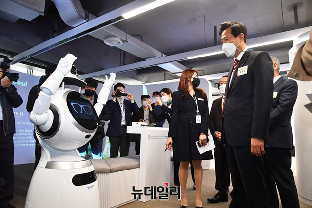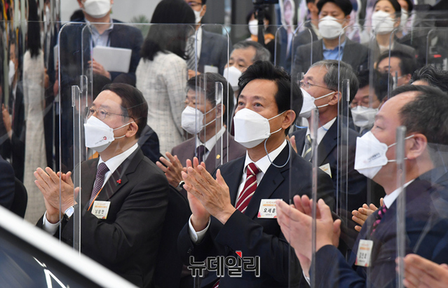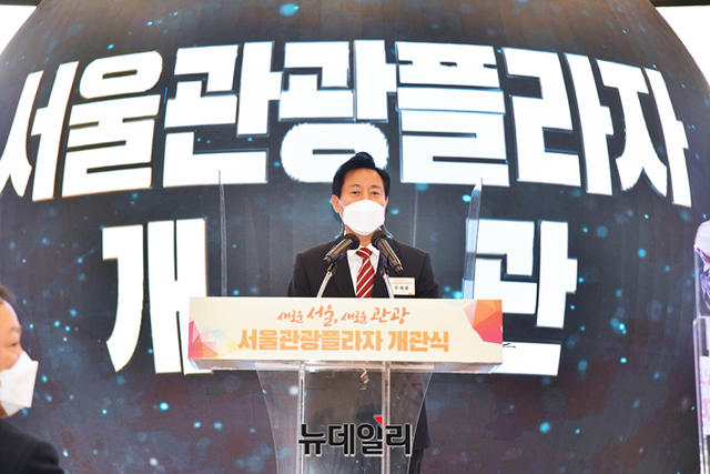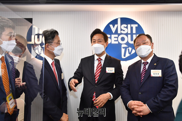 오세훈 서울시장이 29일 오전 서울 종로구 삼일빌딩에서 열린 서울관광플라자 개관식에서 참석자들과 기념촬영을 하고 있다. 서울관광플라자는 관광협회와 해외 관광청, 스타트업 등 서울관광과 관련된 기관을 한 곳에 모은 시설이다. (사진=서울시)