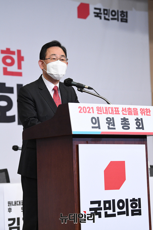 주호영 국민의힘 원내대표가 30일 오전 국회 도서관 대강당에서 열린 국민의힘 원내대표 선출 의원총회에 참석해 인사말을 하고 있다. (사진=공동취재단)