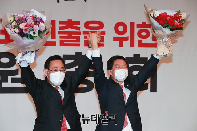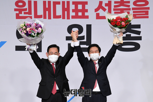 국민의힘 신임 원내대표로 선출된 김기현 의원과 주호영 전임 원내대표가 30일 오전 국회 도서관 대강당에서 열린 국민의힘 원내대표 선출 의원총회에서 두손을 들어 인사하고 있다. (사진=공동취재사진)