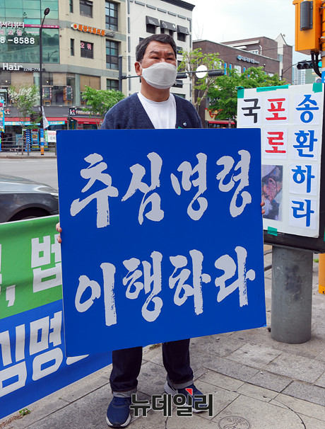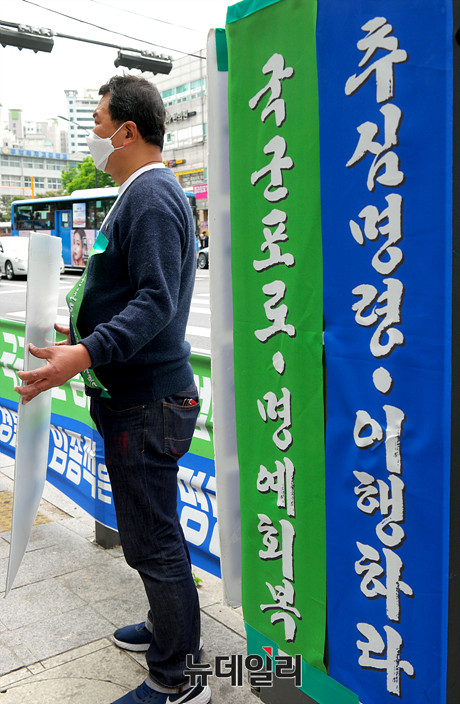 박일남 사단법인 물망초 간사가 1일 오전 서울 성동구 남북경제문화협력재단(경문협) 사무실 앞에서 탈북 국군포로 손해배상 승소 판결 이행 촉구 1인 시위를 하고 있다.
