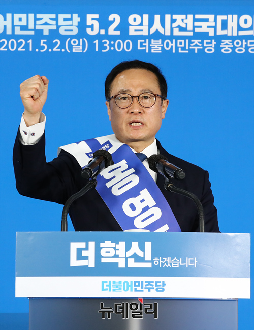 더불어민주당 당대표 경선에 출마한 홍영표 후보가 2일 오후 서울 여의도 중앙당사에서 열린 임시전국대의원대회에서 정견발표를 하고 있다. (사진=공동취재단)