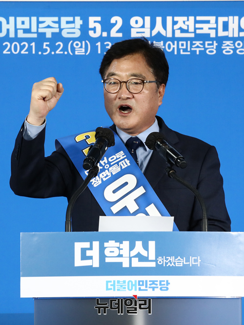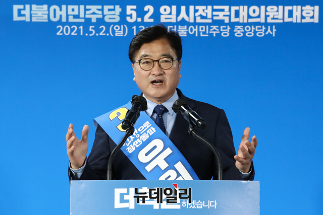 더불어민주당 당대표 경선에 출마한 우원식 후보가 2일 오후 서울 여의도 중앙당사에서 열린 임시전국대의원대회에서 정견발표를 하고 있다. (사진=공동취재단)