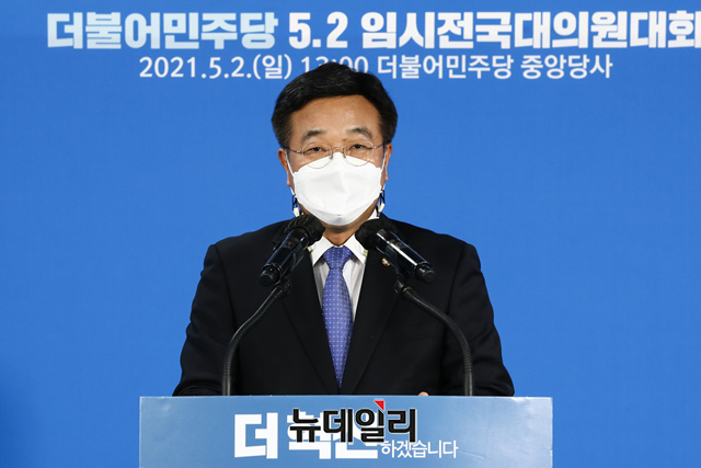 더불어민주당 윤호중 원내대표 겸 비상대책위원장이 2일 오후 서울 여의도 중앙당사에서 열린 임시전국대의원대회에서 인사말을 하고 있다. (사진=공동취재단)