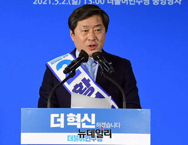 더불어민주당 최고위원회 경선에 출마한 황명선 후보가 2일 오후 서울 여의도 중앙당사에서 열린 임시전국대의원대회에서 정견발표를 하고 있다. (사진=공동취재단)