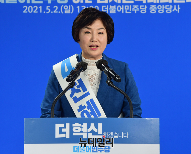 더불어민주당 최고위원회 경선에 출마한 전혜숙 후보가 2일 오후 서울 여의도 중앙당사에서 열린 임시전국대의원대회에서 정견발표를 하고 있다. (사진=공동취재단)