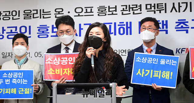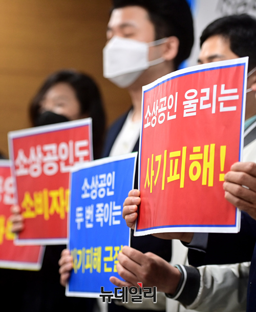 온라인체험광고 사기피해자 모임 소상공인들이 4일 오전 서울 동작구 소상공인연합회 회의실에서 열린 '소상공인 대상 홍보 사기 피해 대책 수립 촉구 기자회견'에서 피해대책을 촉구하고 있다.