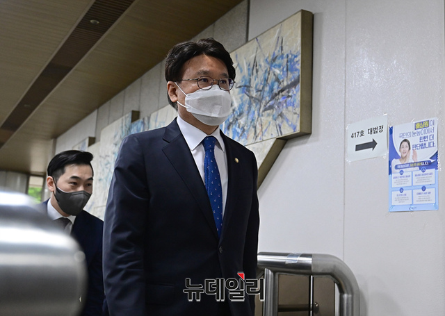 황운하 전 울산지방경찰청장이 10일 오후 서울 서초구 서울중앙지법에서 열린 청와대의 울산시장 선거개입·하명수사 의혹 사건 재판에 참석하기 위해 법정으로 이동하고 있다.