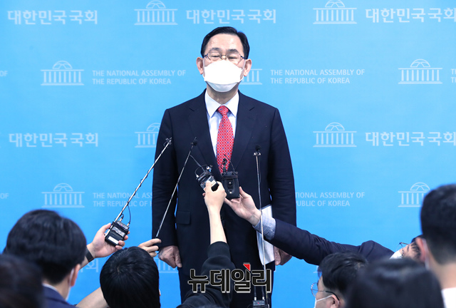 주호영 국민의힘 의원이 10일 오전 국회 소통관에서 열린 6월 전당대회 관련 출마선언 기자회견을 마친 후 기자들의 질문에 답하고 있다.