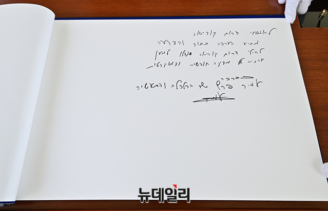 아미르 페렛츠(Amir Peretz) 이스라엘 경제부 장관이 11일 오전 서울 동작구 국립서울현충원 현충탑을 찾아 참배하고 방명록을 작성하고 있다.