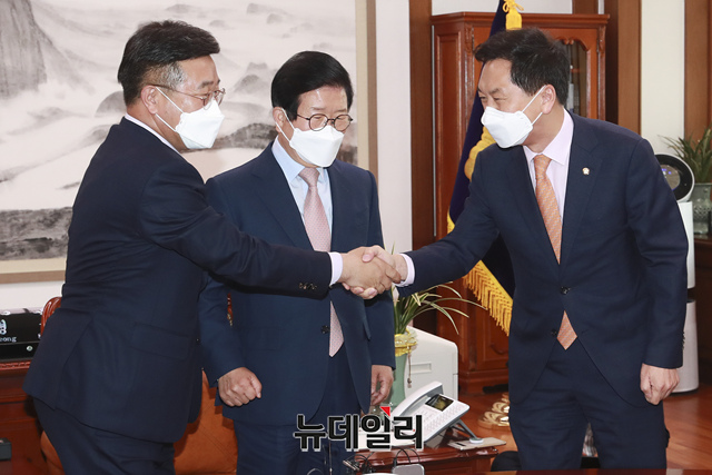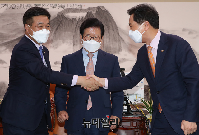 윤호중 더불어민주당 원내대표와 김기현 국민의힘 대표 권한대행 겸 원내대표가 11일 오전 국회에서 박병석 국회의장 주재 회동에 앞서 악수를 나누고 있다. (사진=공동취재단)