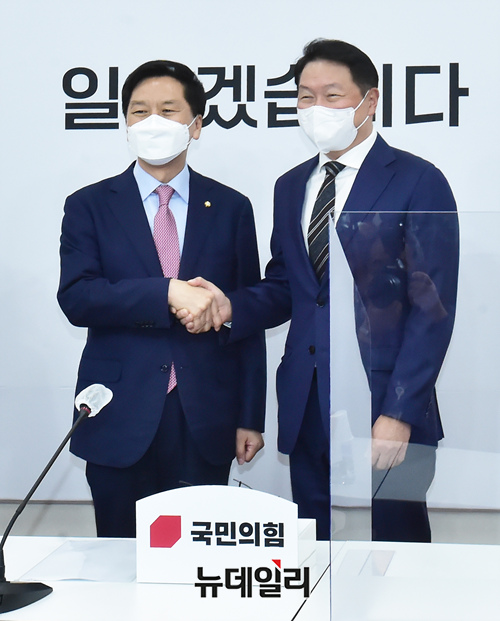 최태원 대한상공회의소 회장이 13일 오후 국회를 찾아 김기현 국민의힘 원내대표를 예방해 악수를 나누고 있다. (사진=공동취재단)