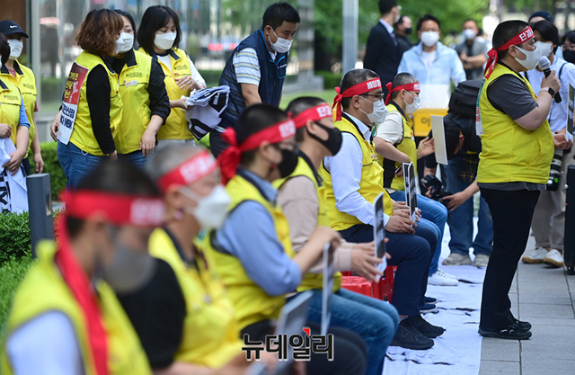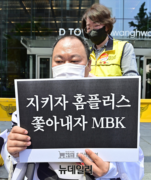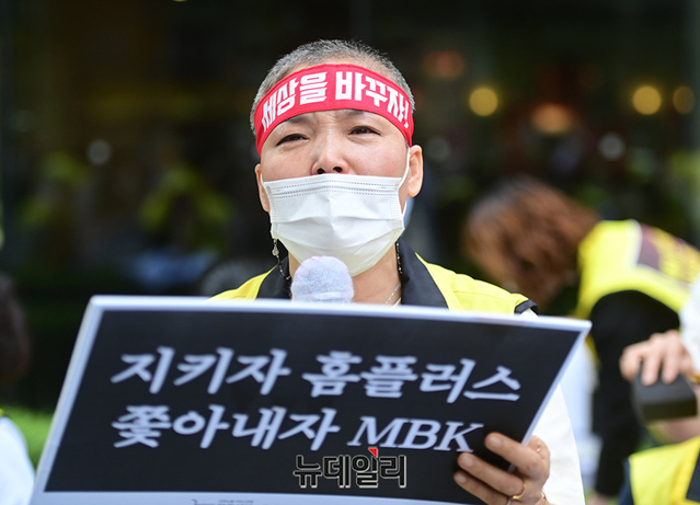 홈플러스 여성노동자들이 13일 오후 서울 종로구 MBK 본사 앞에서 홈플러스 운영사인 MBK의 점포 폐점과 매각에 반대하며 집단 삭발식을 갖고 발언하고 있다.