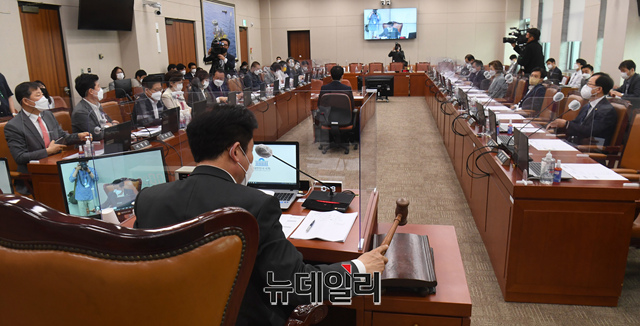 송갑석 더불어민주당 간사가 17일 오전 국회에서 열린 산업통상자원중소벤처기업위원회 전체회의를 주재하고 있다. 이 날 산자위는 손실보상법 관련 입법청문회 실시계획서 채택의 건을 의결했다. (사진=공동취재단)