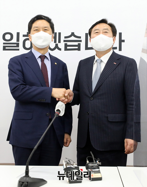 김기현 국민의힘 대표 권한대행 겸 원내대표가 17일 오전 국회에서 김기문 중소기업중앙회장을 접견하고 인사를 나누고 있다. (사진=공동취재단)