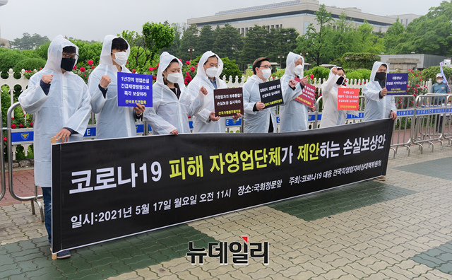코로나19 대응 전국자영업자비상대책위원회 회원들이 17일 오전 국회 앞에서 열린 손실보상안 제안 기자회견에서 내수활성화를 위한 조치와 손실보상안 신속 검토 등을 촉구하며 구호를 외치고 있다.
