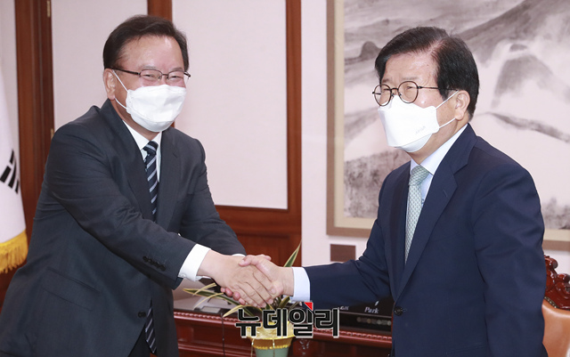 박병석 국회의장이 17일 오후 국회에서 김부겸 신임 국무총리를 만나 악수를 나누고 있다. (사진=공동취재단)
