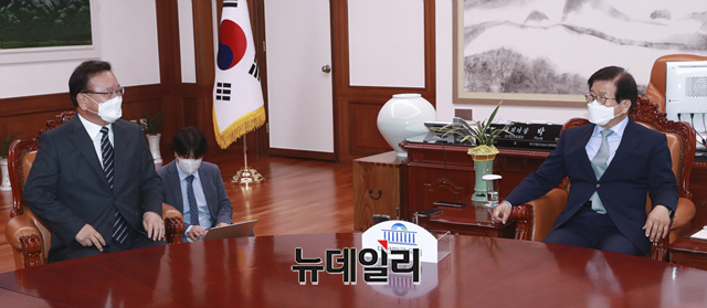박병석 국회의장이 17일 오후 국회에서 김부겸 신임 국무총리를 만나 환담을 나누고 있다. (사진=공동취재단)
