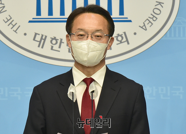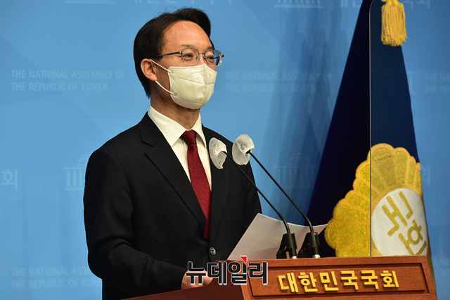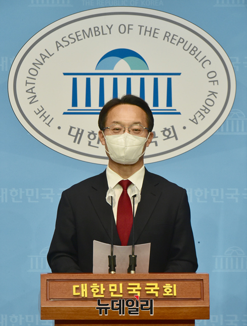 국민의힘 당대표 선거 출마선언을 한 조해진 의원이 18일 국회 소통관에서 전당대회 관련 기자회견을 하고 있다.