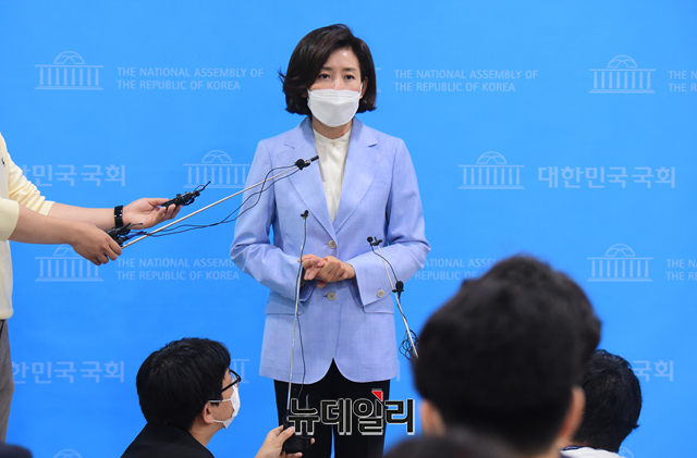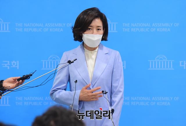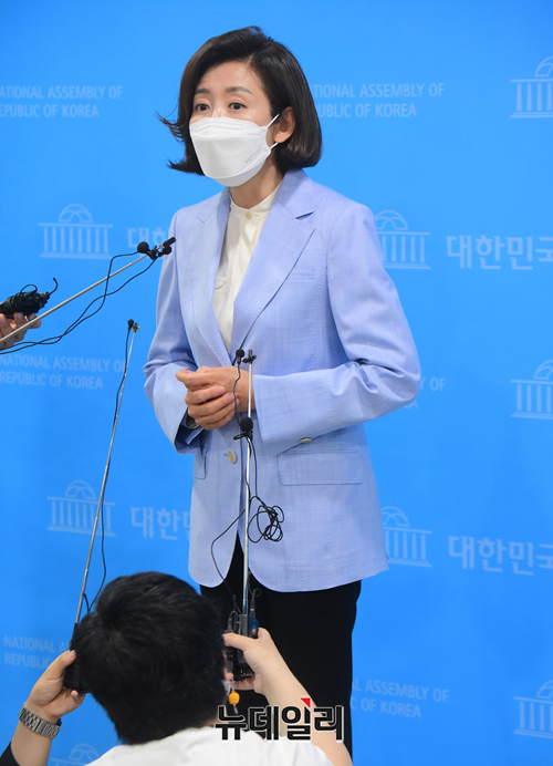 나경원 국민의힘 전 의원이 20일 오전 국회 소통관에서 열린 국민의힘 대표 출마선언 기자회견을 마치고 기자들의 질문에 답하고 있다.