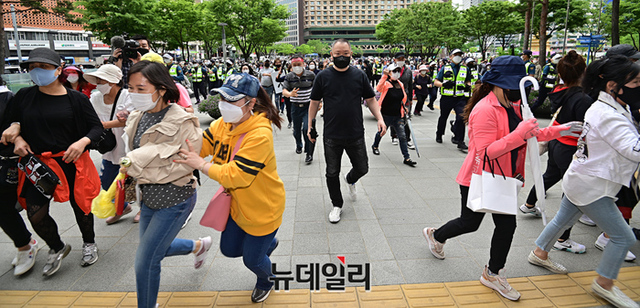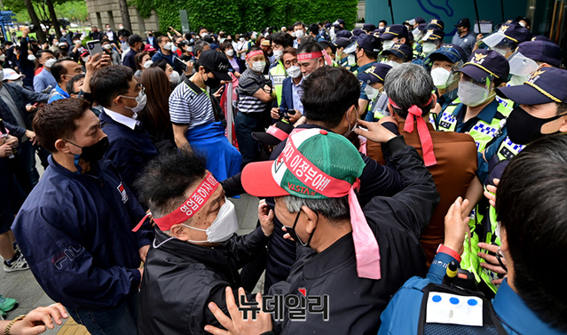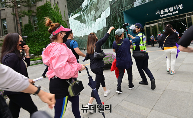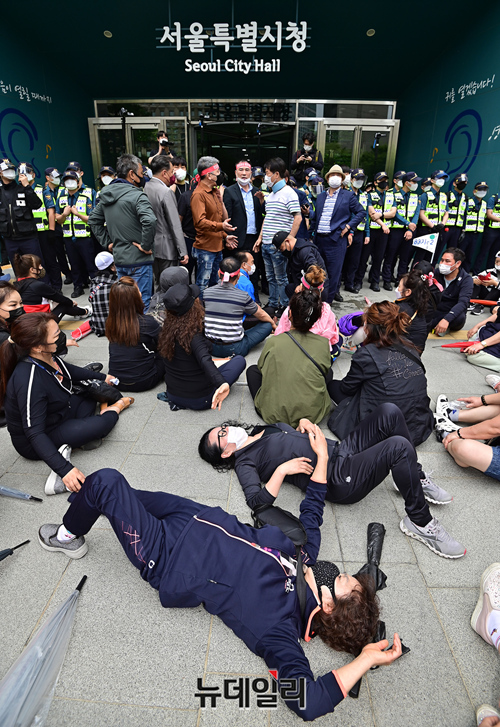 집합금지업종 자영업자들이 20일 오후 서울 중구 서울시청 앞에서 기자회견을 열고 "300일 넘는 집합금지를 해제하고, 차별적인 집합금지 명령을 철회하라"고 주장했다.이날 기자회견에는 한국유흥음식업중앙회, 한국단란주점업중앙회, 한국콜라텍협회 회원 약 300여 명이 참가했다. 이들은 현재 영업이 가능한 노래방, 주점, 식당 카페와 같이 정상적인 영업을 해달라며 불공평한 방역정책을 멈출 것을 촉구했다.기자회견 직후 오세훈 서울시장과 면담을 요구하며 청사로 진입하다 막아선 경찰과 충돌했다.