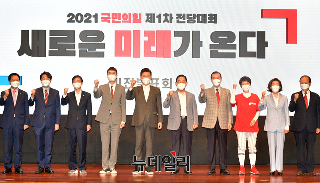 국민의힘 당대표로 출마한 후보들이 25일 오전 서울 마포구 누리꿈스퀘에서 열린 국민의힘 1차 전당대회에서 기념사진을 촬영하고 있다. (왼쪽부터 이준석, 조경태, 김웅, 윤영석, 주호영, 홍문표, 김은혜, 나경원 후보.)