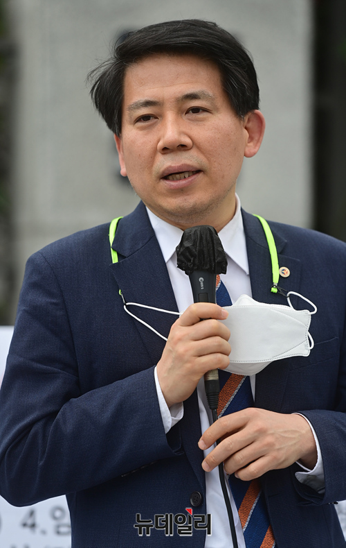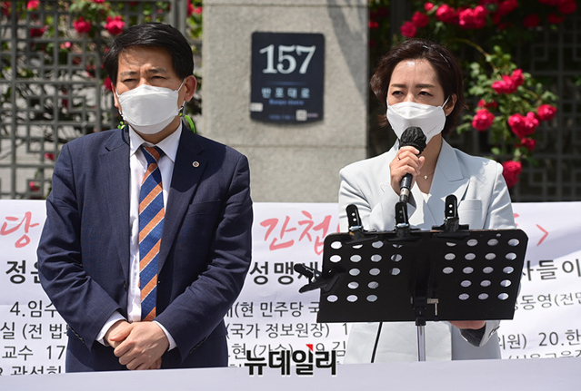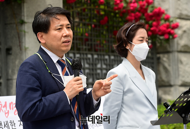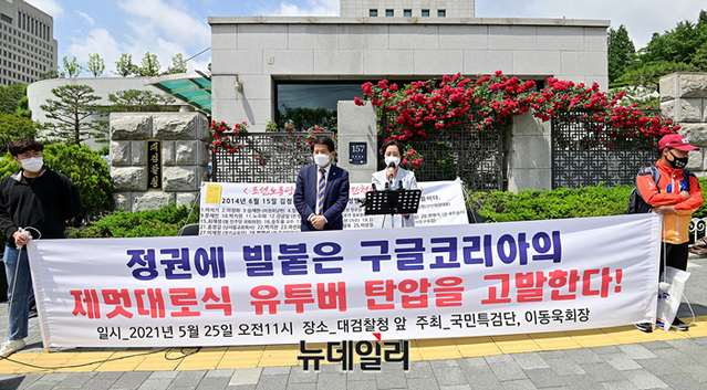 이동욱 경기의사회장과 강연재 국민특검단 변호사가 25일 오전 서울 서초구 대검찰청 앞에서 구글코리아의 유튜버 탄압을 규탄하는 기자회견을 갖고 있다.이들은 "최근 정치 여론뿐 아니라 코로나와 관련된 비판의 목소리는 무조건 차단, 삭제, 폐쇄하는 식의 정부 비판 탄압이 도를 넘고 있다"며 "공산주의식 여론 검열과 갑질 탄압을 절대 좌시하지 않고 '한국자유유튜버총연합회'를 결성해 모든 표현의 자유를 탄압하는 정부 및 구글코리아에 대해 민·형사상 법적 대응을 공동으로 해나갈 것이다"고 말했다.