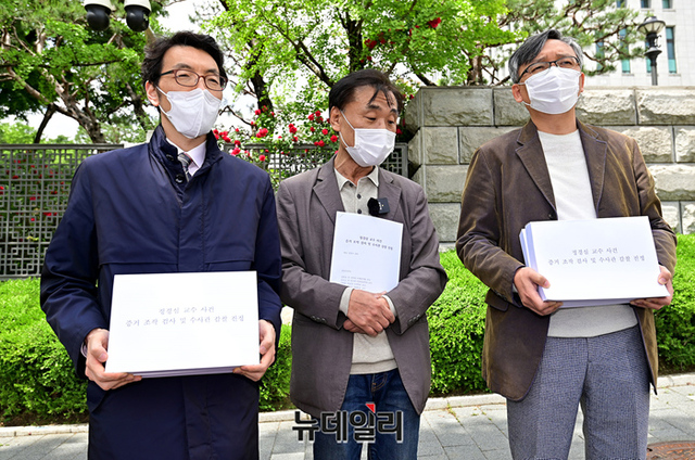 고일석(가운데) 더브리핑 대표가 25일 오전 서울 서초구 대검찰청으로 정경심 교수 사건 증거조작 검사 및 수사관 감찰 진정을 제출하기 위해 입장하고 있다.