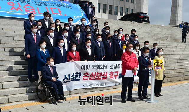 민병덕 더불어민주당 의원, 최승재 국민의힘 의원, 심상정 정의당 의원이 25일 오전 국회에서 열린 여야 국회의원, 소상공인 자영업자 신속한 손실보상 촉구를 위한 기자회견에서 회견문을 낭독하고 있다.