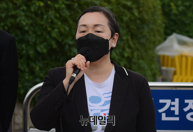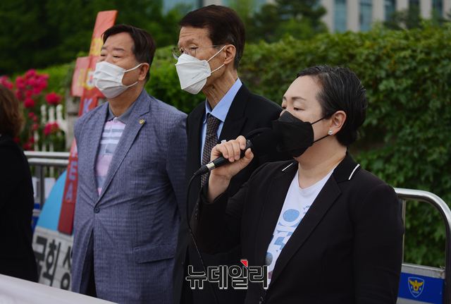 인지연 미국 변호사가 25일 오전 국회 정문 앞에서 열린 '북한인권을 위한 화요집회'에서 발언을 하고 있다.