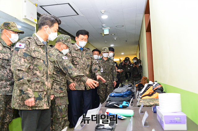 송영길 더불어민주당 대표가 27일 오전 경기 양주시 72사단 202여단을 방문해 장병 생활관을 살펴보고 있다.(사진=더불어민주당)