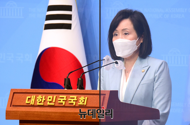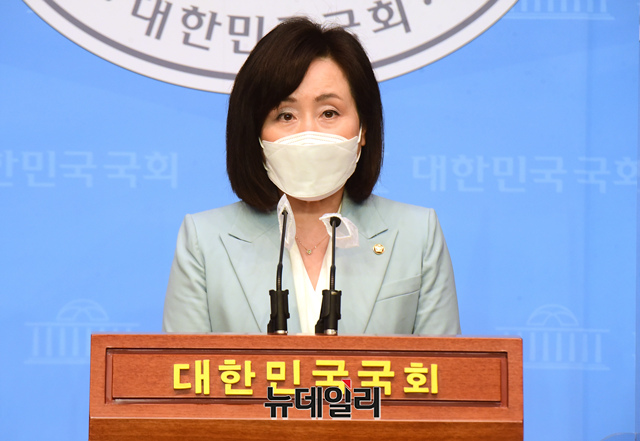 전주혜 국민의힘 의원이 27일 오후 국회 소통관에서 김오수 검찰총장 후보자 인사청문회 파행 관련 기자회견을 갖고 있다.