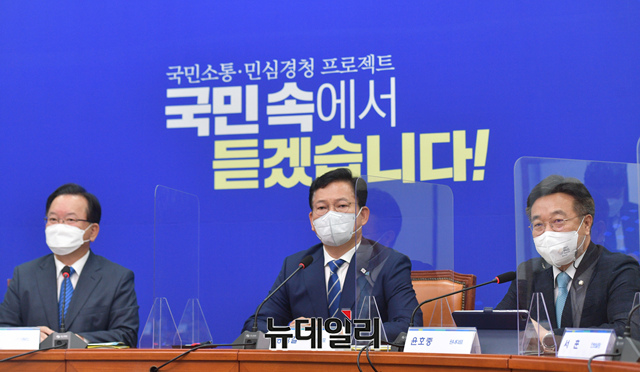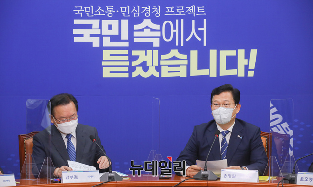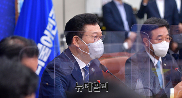 송영길 더불어민주당 대표가 28일 오전 국회에서 열린 고위 당정청협의회의에 참석해 모두발언을 하고 있다. (사진=공동취재단)