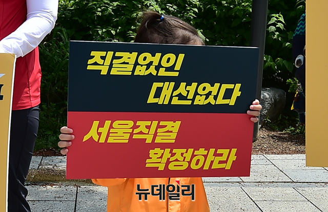 GTX-D 김포 하남 직결 및 김포한강선 연장 촉구 기자회견이 28일 오후 서울 청와대 앞 분수대에서 김포검단시민연대 주최로 열린 가운데 주민들이 피켓을 들고 있다.