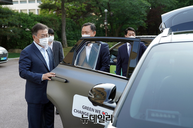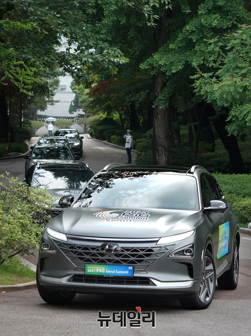문재인 대통령이 28일 오후 청와대 여민관 앞에서 '2021 서울 녹색미래 정상회의' 홍보 문구를 랩핑한 수소차에 탑승해 운전하고 있다. '2021 서울 녹색미래 정상회의'는 30일과 31일 양일간 '포용적인 녹색회복을 통한 탄소중립 비전실현'을 주제로 서울에서 개최된다. (사진=청와대)