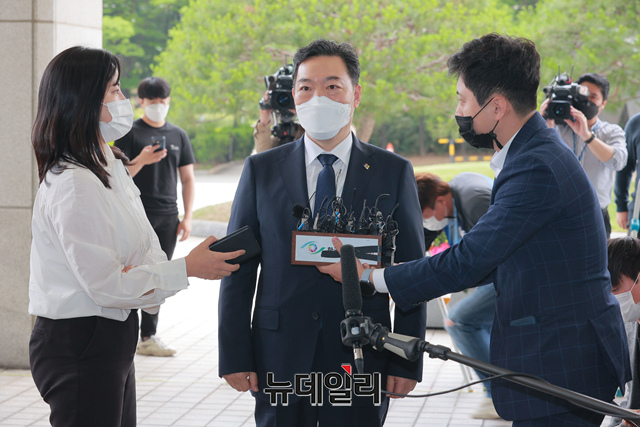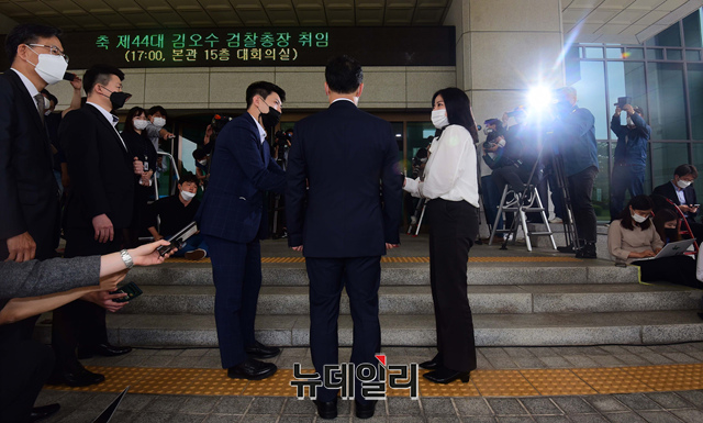 김오수 신임 검찰총장이 1일 오후 서울 서초동 대검찰청 청사에서 열린 취임식에 앞서 기자들의 질문에 답하고 있다.