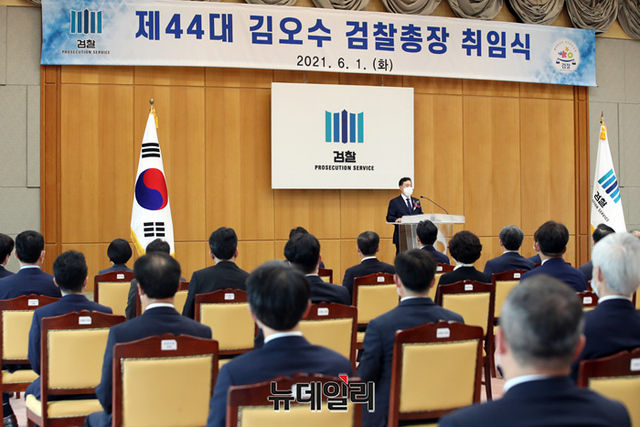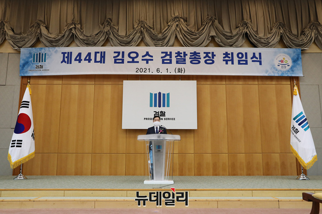 김오수 신임 검찰총장이 1일 오후 서울 서초구 대검찰청에서 열린 취임식에서 취임사를 하고 있다.