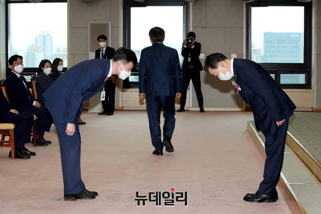 김오수 신임 검찰총장과 조상철 서울고검장이 1일 오후 서울 서초구 대검찰청에서 열린 김오수 검찰총장 취임식에서 인사를 나누고 있다.