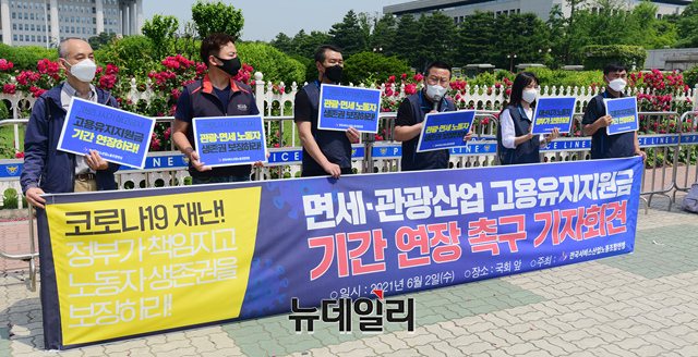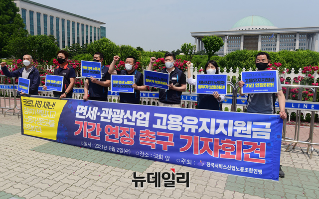 전국서비스산업노동조합연맹이 2일 오전 국회 앞에서 기자회견을 갖고 면세·관광산업 고용유지지원금 기간 연장을 촉구 기자회견을 갖고 있다.